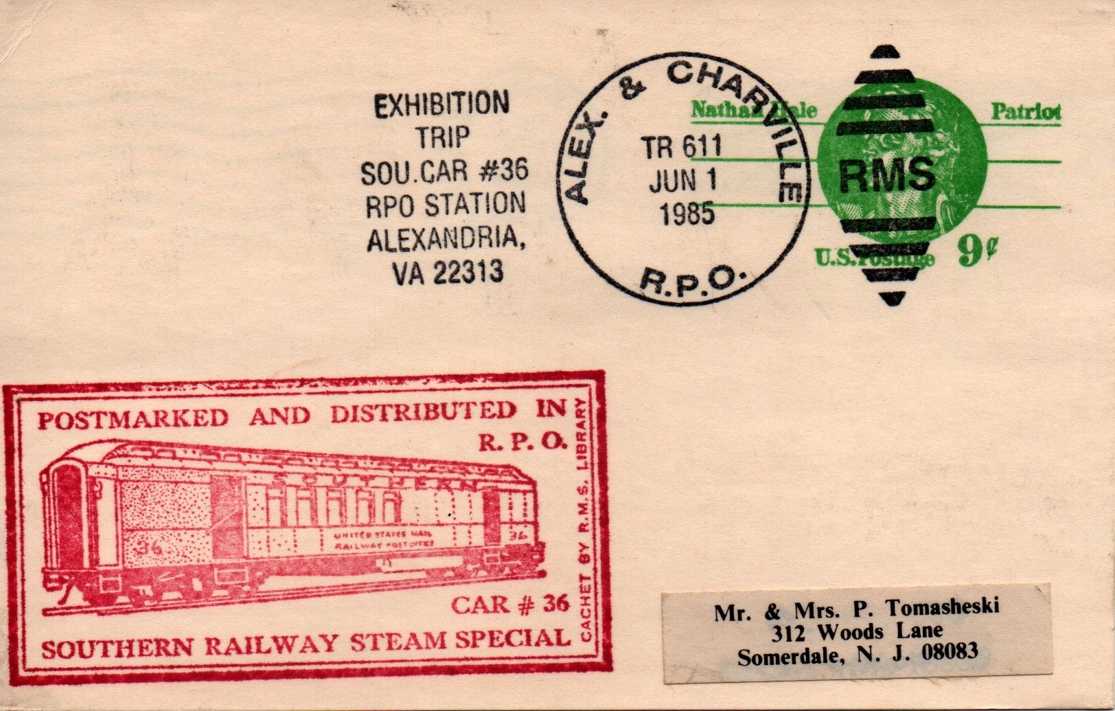 This was on a special Exhibit train. The RPO could not be found in the Book. It has a clear receiving cancel on the back from Alexandria VA.