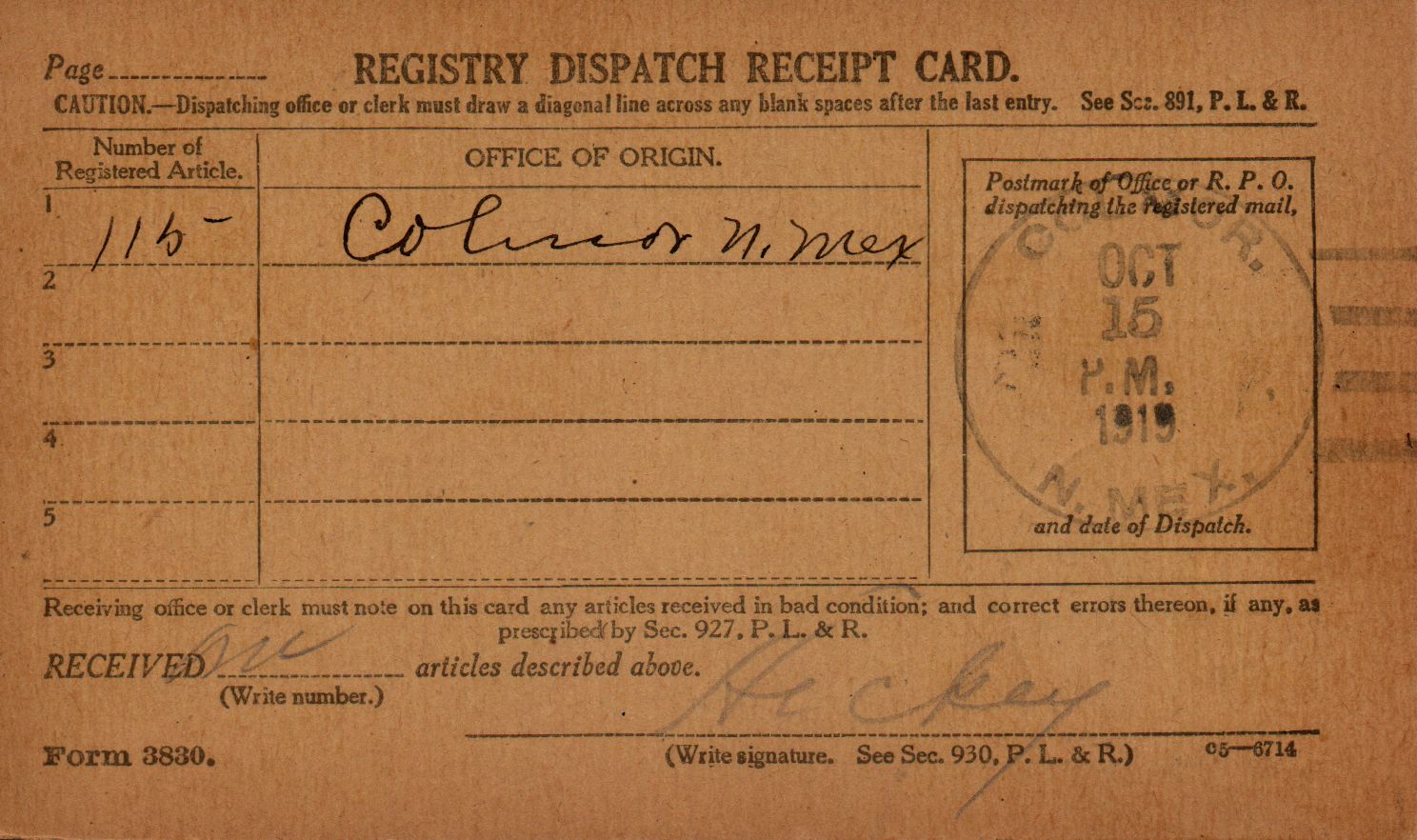 This is a Registry Dispatch Receipt Card, used within the Post Office.